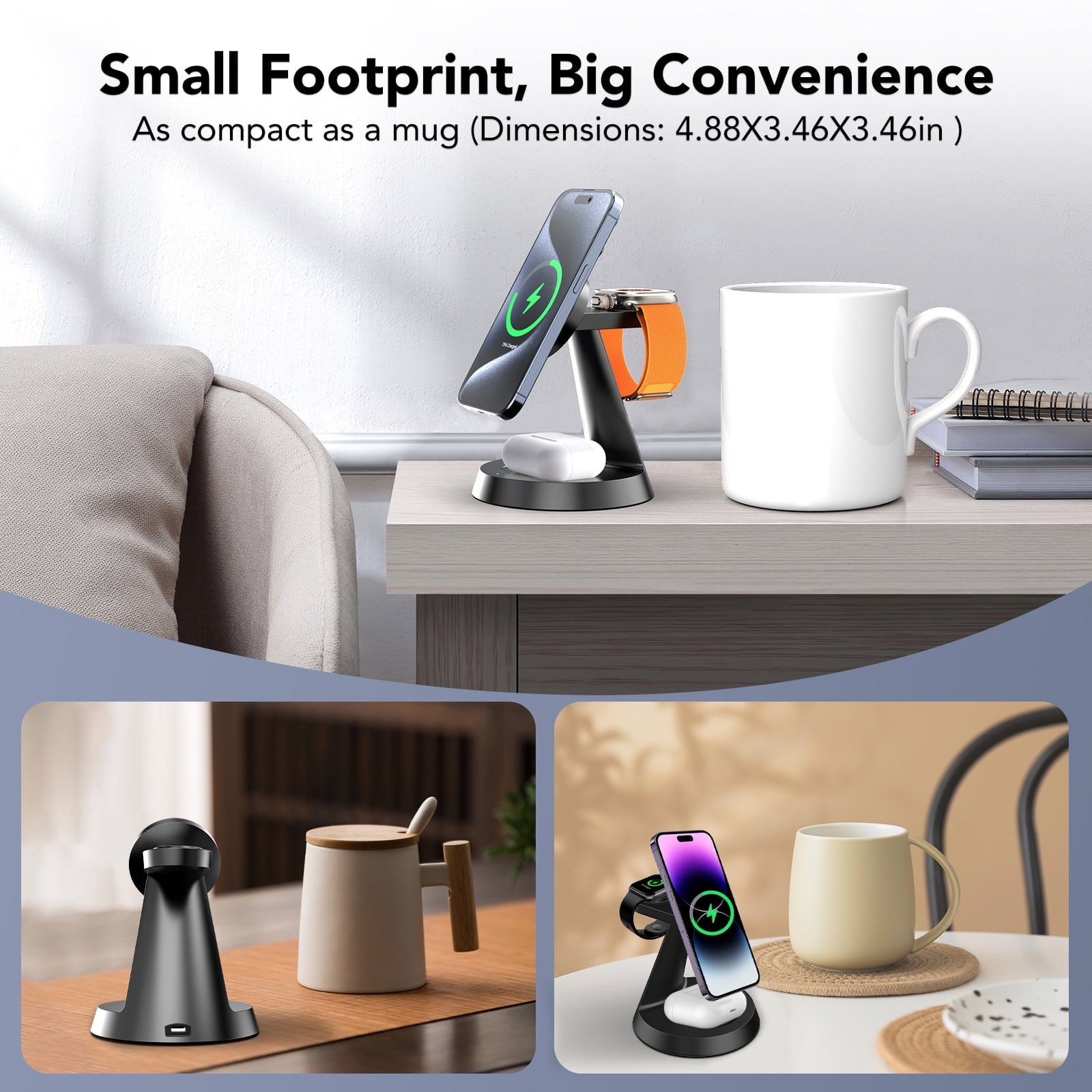 Absolutely love this charging station! It’s sleek, fast, and keeps my iPhone, Apple Watch, and AirPods all powered up in one cute pink package. No more cord chaos on my nightstand. The magnetic alignment is spot on, and it charges everything overnight without overheating. A total game changer for my daily routine.