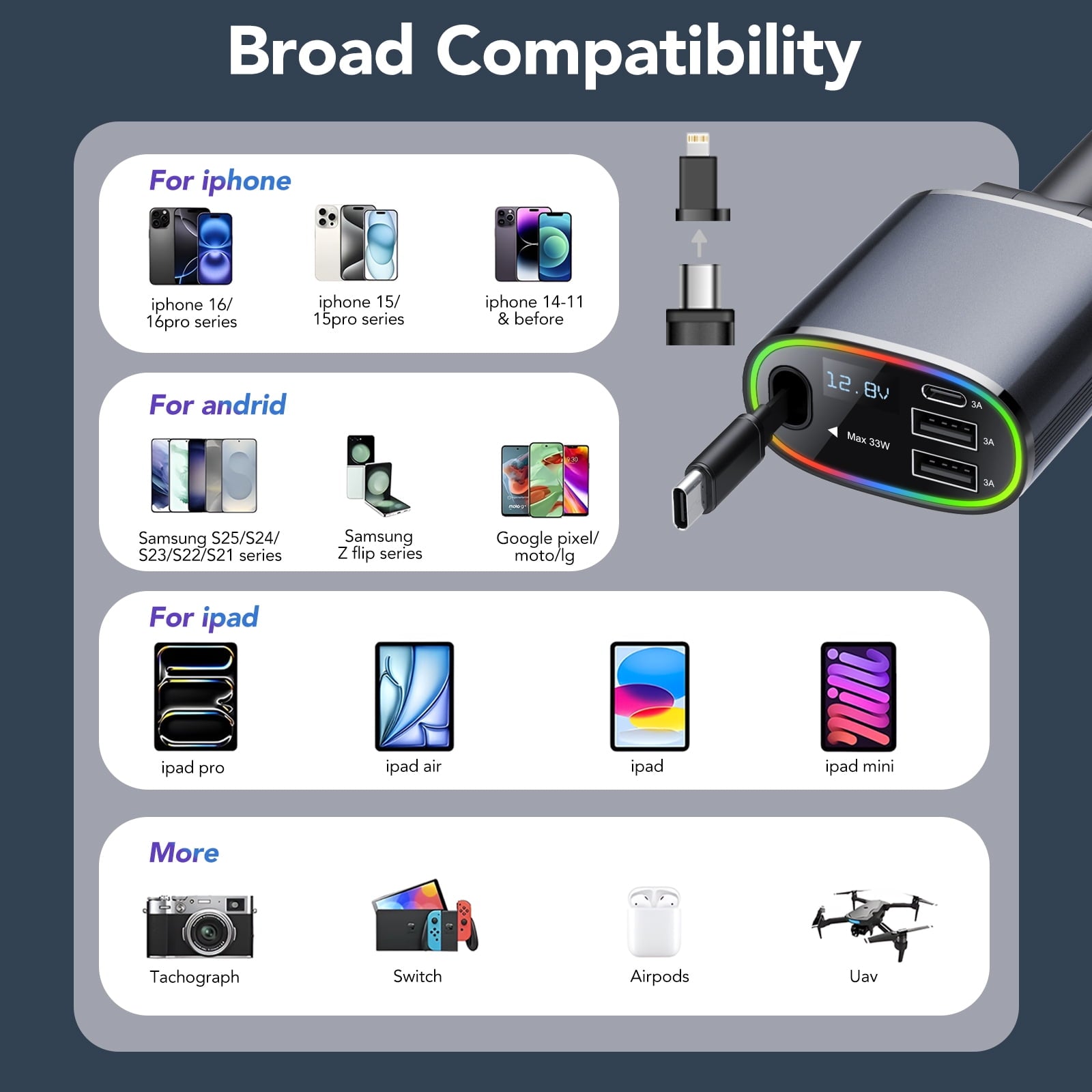 - Combines a compact design(5 x 2.2 x 1.25 inches) with powerful performance. The retractable cord extends up to 31.5 inches, making it ideal for long trips, tight spaces like semi truck cabins, or everyday use. A practical choice for personal needs or as a holiday gift (Christmas/Thanksgiving), this charger delivers convenience and reliability on the go.