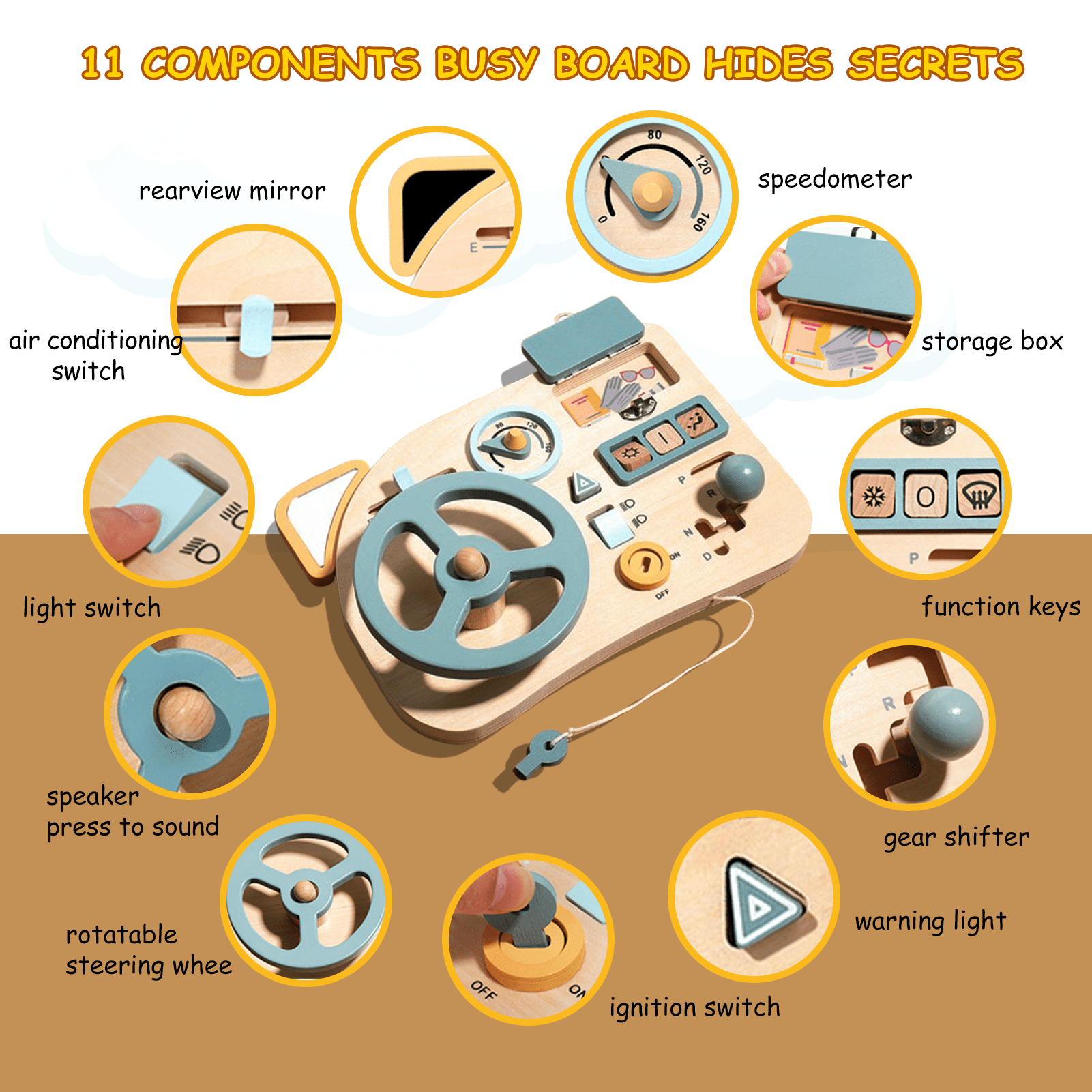 - 【toddler toys】busy board with 10 motor skills activity include turnable steering wheel, rearview mirror, air conditioning switch, warning light, horn and more.