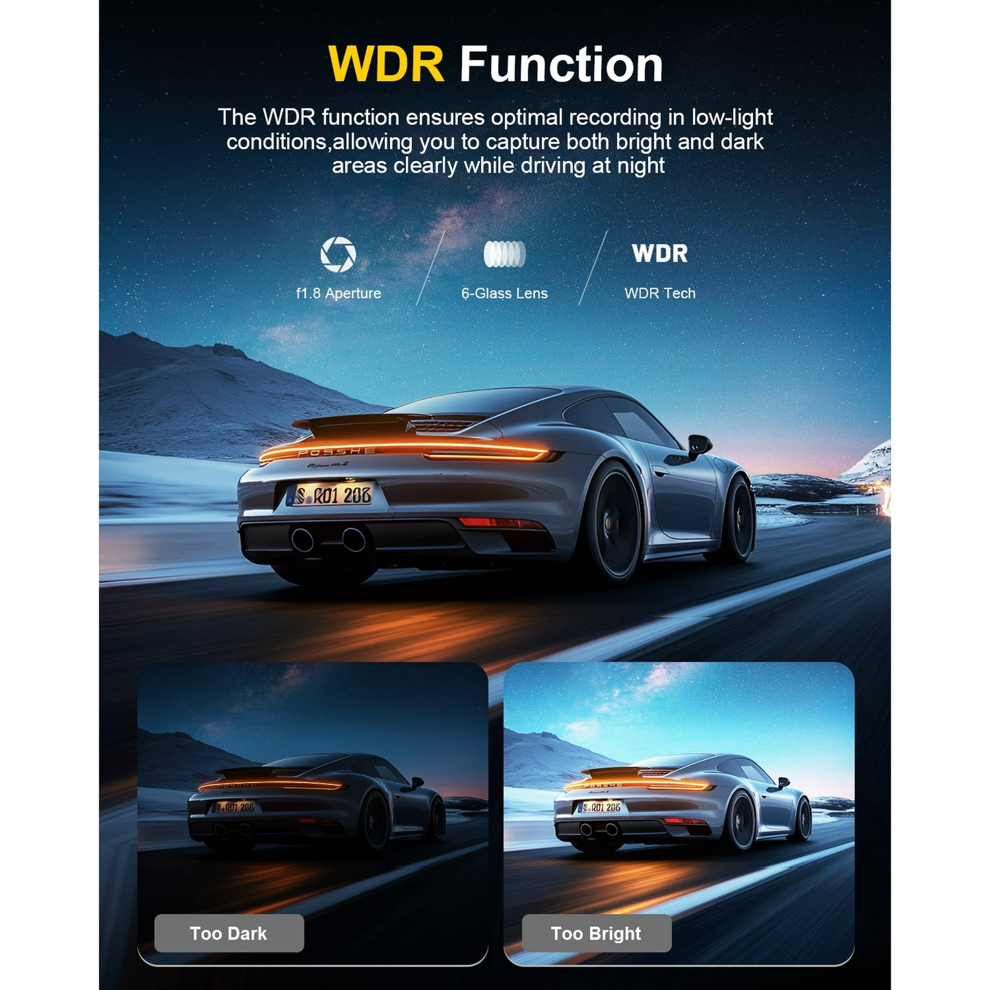 - 【Reliable G-Sensor and Super Night Vision】This dash cam combines F/1.8 aperture and 6-glass lens with WDR technology. It ensures good lighting at night with low exposure. Its G-sensor function ensures that all emergency situations (such as scratches, etc.) are sensed and recorded and locked (and the sensitivity level can be set according to your preference).